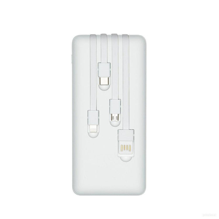 Prenosna polnilna baterija z vgrajenimi kabli Micro USB, Type-C, MFi Lightning, USB-A za polnjenje.