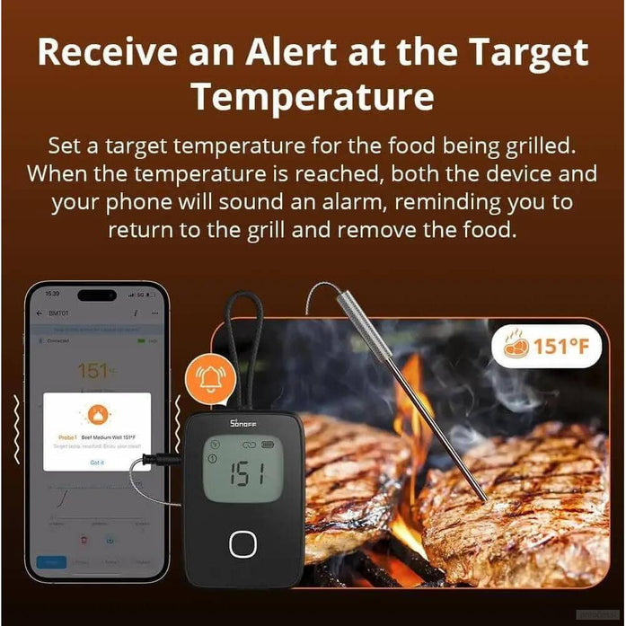 Termometer za meso SONOFF BBQ prenaša podatke o temperaturi neposredno na vaš telefon, tako da lahko kadar koli preverite temperaturo mesa na žaru. -