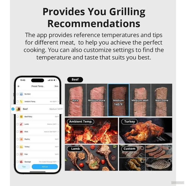 Aplikacija ponuja referenčne temperature in nasvete za različne vrste mesa (govedina, jagnjetina, perutnina, ribe, klobase …). Nastavitve lahko tudi prilagodite po meri za popoln okus.