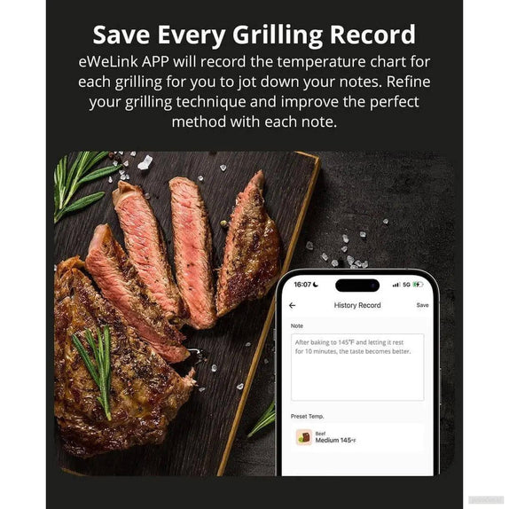 Aplikacija eWeLink beleži temperaturni graf za vsako peko, kjer lahko dodate svoje opombe. Izpopolnite svojo tehniko pečenja z vsakim zapisom.