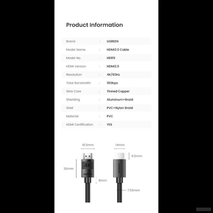 kabel UGREEN 4K HDMI 2.0 v celoti podpira visokokakovostno sliko 4_4:4 Chroma, HDR/HDR 10, 1080P HD, UHD in 1440p QHD. 4K HDMI HDR Lead ima 3D učinek, 48-bitno globoko barvo in način Mirror & Extend, podpira tudi monitor Full HD 16_9 in ultra-širok zaslon za igre 21_9. Kabel 4K HDMI UHD je idealen spremljevalec za hišni kino, igralne centre in konferenčne sobe.