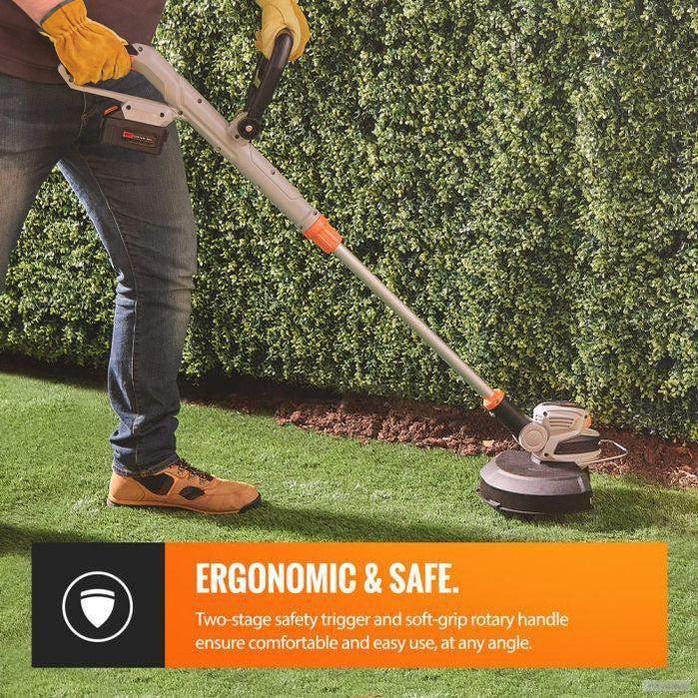 S premerom rezanja 300mm in nastavljivo glavo za dosego vašega idealnega kota rezanja, prirezovalnik vključuje tudi možnost rezalnega kolesa za robove, ki pomaga ohranjati urejene meje vrta.