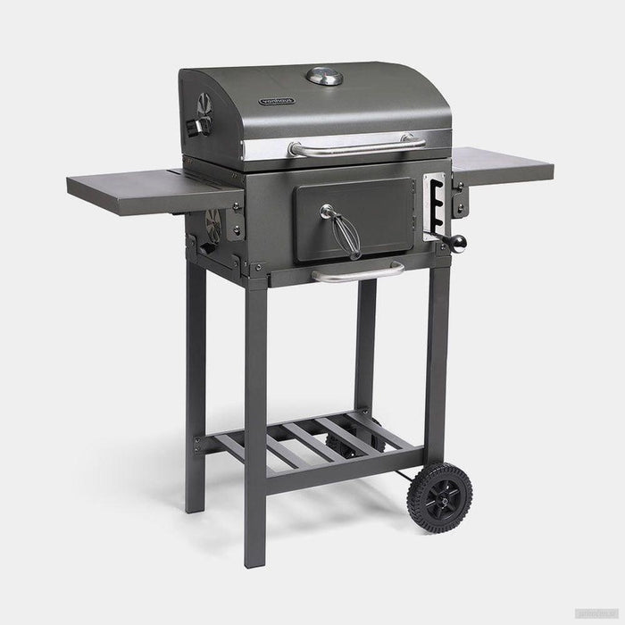 - Žar na oglje je zaradi svoje kompaktne velikosti, zložljivih polic in dveh gladkih koles preprost za premikanje in shranjevanje.