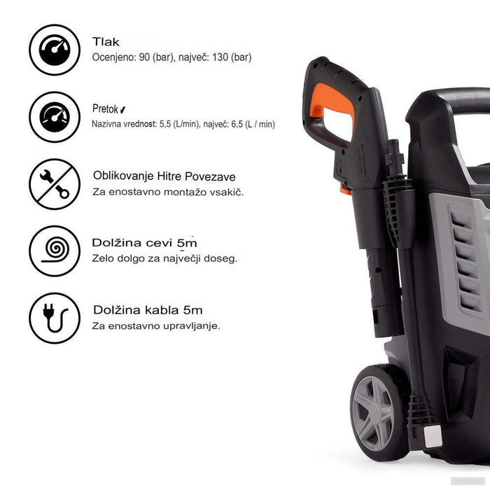 - Nastavljiv tlak med 90 in 130 bar ter pretok vode med 5 in 6,5 l/min omogočata čiščenje teras, avtomobilov in še več.